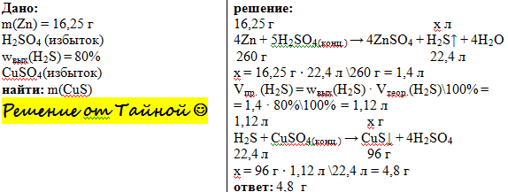 Цинк массой 16,25г растворили в избытке концентрированной серной кислоты. Выделившийся сероводород, выход которого составил 80%, пропустили через избыток раствора сульфата меди (II). Определите массу выпавшего осадка.