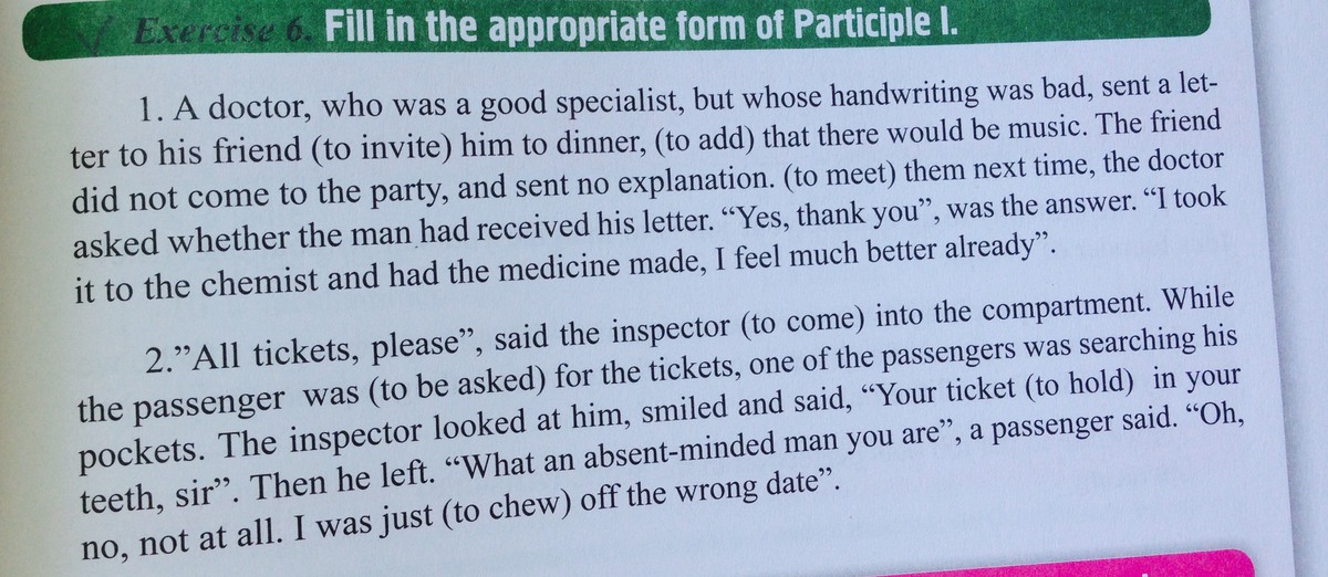 A doctor, who was a good specialist, but whose handwriting was bad, sent a let-ter to his friend (to invite) him to dinner, (to add) that there would be music. The friend did not come to the party, and sent no explanation. (to meet) them next time, the doctor asked whether the man had received his letter. "Yes, thank you", was the answer. "I took it to the chemist and had the medicine made, I feel much better already". 2."All tickets, please", said the inspector (to come) into the compartment.
