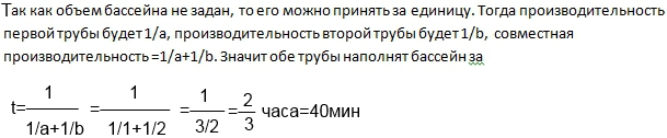 Одна труба заполняет бассейн за 1 час, а другая за 2 часа. За сколько часов они заполнят бассейн, работая вместе?