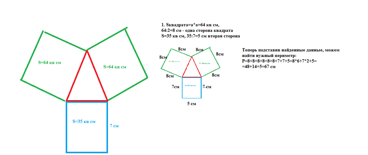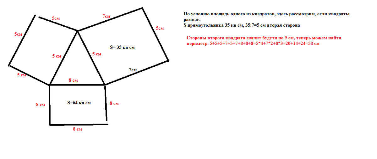 прямоугольника 35 кв.см, причем сторона прямоугольника, не общая со стороной треугольника, равна 7 см, а площадь одного из квадратов равна 64 кв.см. Найдите периметр фигуры, образованной треугольником, прямоугольником и квадратами. Рассмотрите разные случаи.