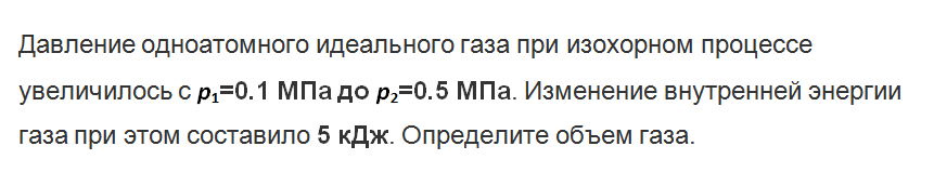 p1=0,1 МПа до p2=0,5 МПа. Изменение внутренней энергии газа при этом составило 5 кДж. Определите объем газа.