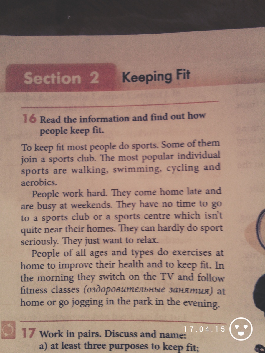 Чтобы поддерживать свое физическое состояние многие люди занимаются спортом. Некоторые ходят в спортивные клубы. Самые уединенные занятие - это ходьба, плавание, велоспорт и аеробика.