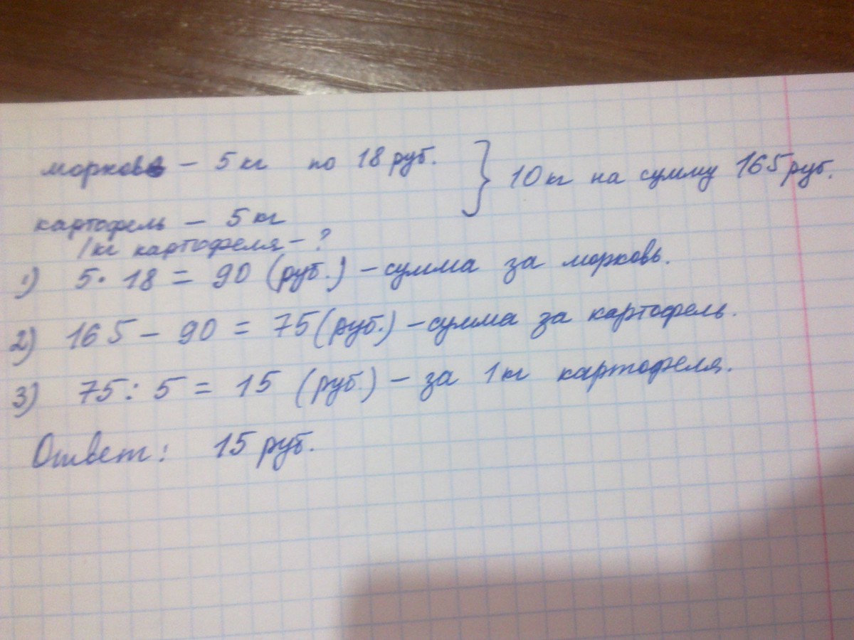 пожалуста помагите пишите решение. На рынке купили 5 кг моркови по 18 рублей за килограмм и такое же количество картофеля. Вся покупка обошлась в 165 рублей. Сколько стоит 1кг. картофеля?