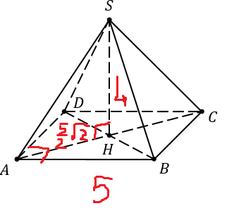 Дано: SABCD - ч/у прав.пир., АВ=5, SH=4