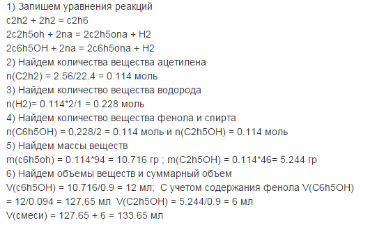 Какой объём 9,4%-го раствора фенола в этаноле (плотность 0,9г/мл) должен прореагировать с избытком металлического натрия,чтобы выделившимся водородом можно было полностью каталитически гидрировать ацетилен объёмом 2,56 л (н.у)?Приведите подробное решение задачи.