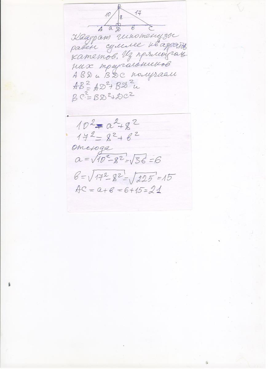Из точки взятой на расстоянии 8 см от прямой, проведенный к ней 2 наклонные 17 см и 10 см.Найти расстояние между основаниями этих наклонных.