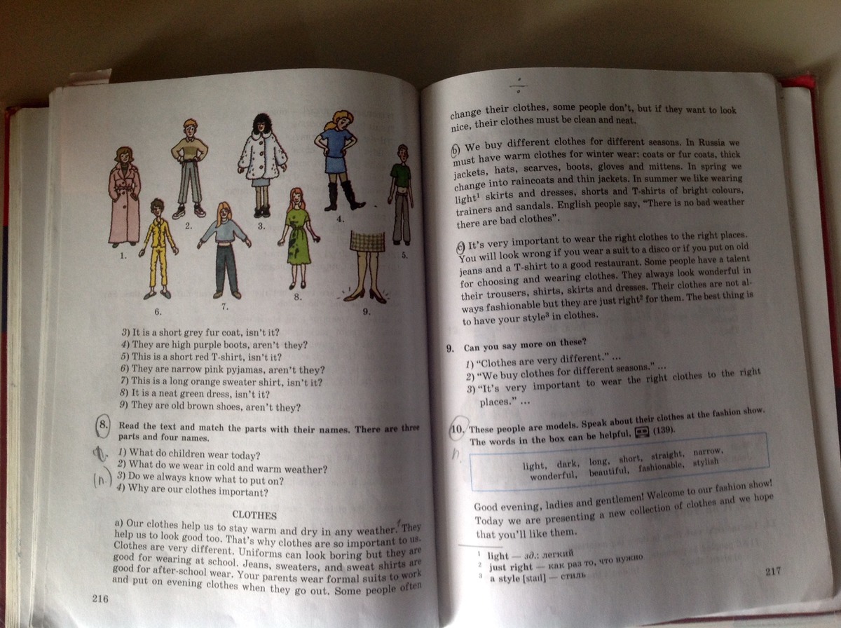 б) Мы покупаем разную одежду для разных времен года. В России мы должны иметь теплую одежду для зимы: пальто или шубы, толстые куртки, шапки, шарфы, перчатки и варежки. Весной мы переодеваемся в плащи и тоненькие куртки. Летом мы любим носить легкие юбки и платья, шорты и футболки ярких цветов, кроссовки и сандалии (босоножки). Англичане говорят: У нас нет плохой погоды, у нас плохая одежда.