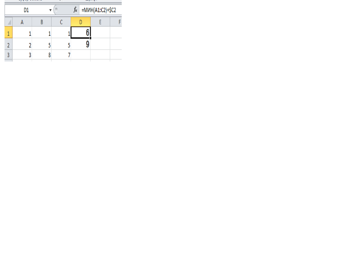 =МИН(A2:C3)+$C3, которая будет искать минимальное значение в А2:С3 и прибавит к полученному минимуму значение из С3