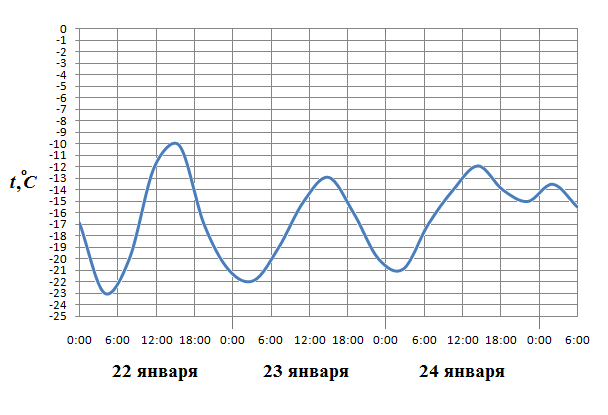 на рисунке показано изменение температуры воздуха на протяжении ТРЁХ суток по горизонтали указывается ДАТА И время суток по вертикали значение температуры в градусах цельсия.Определите по рисунку наибольшую температуру воздуха 22 января.