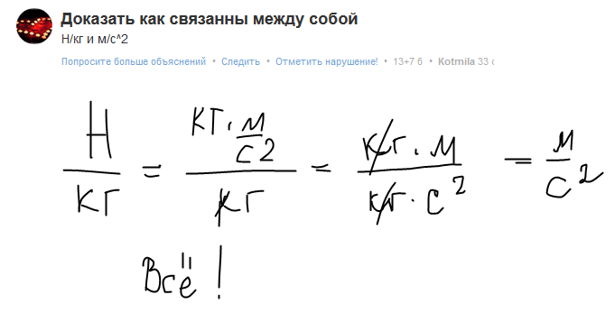 Далее , в числителе вместо ньютона уже появляются кг * м/c² . В знаменателе по прежнему остаются килограммы ( по условию ). Килограмм в числите и знаменателе сокращаются , итого остаются м/c².
