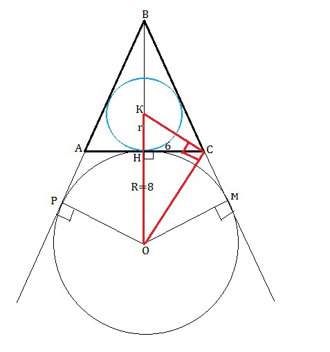 Отрезок ОН=R=8 - радиус вневписанной окружности.