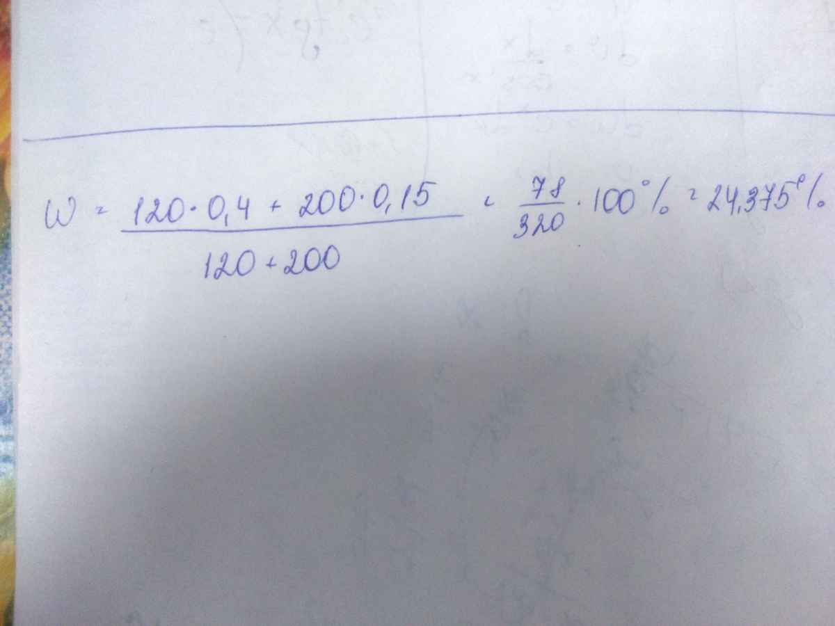 Определите массовую долю (в %) хлорида натрия, полученного при смешивании двух растворов хлорида натрия: массой 120 г с массовой долей NaCl 40% и массой 200 г с массовой долей NaCl 15%.