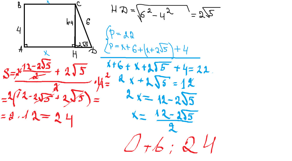 периметр трапеции равен 22 дм боковая сторона=6 и 4 см h=4 дм нацти площадь