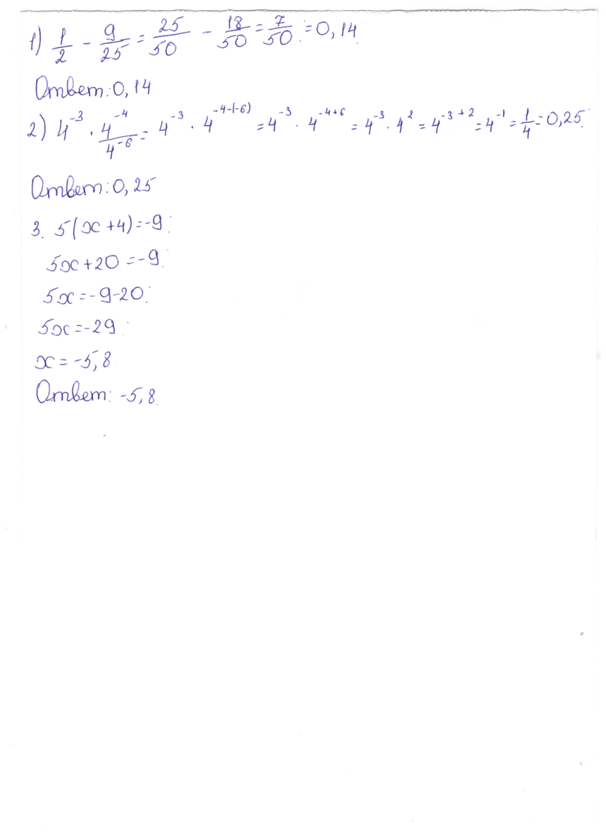 помогите пожалуйста решить,а то я эти примеры совсем не понимаю ; 1)1/2-9/25 ; 2)4^-3 * 4^-4 / 4^-6 ; 3)5(х+4)=-9