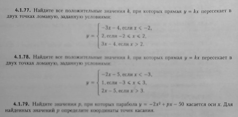 При возрастания углового коэффициента k до 3 (пока график y=kx не станет параллельной y = 3x-4) прямая y=kx ломанную пересекает в двух точках: одна на средней части (y=2) , другая правую часть (y =3x -4).