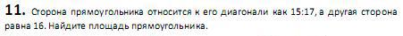 АВСD прямоугольник АВ=16, ВС/АС=15/17=15х/17х, АВ в квадрате=АС в квадрате-ВС в квадрате, 256=289*х в квадрате-225*х в квадрате, 256=64*х в квадрате, х=2, ВС=15*2=30, АС=17*2=34, площадь=АВ*ВС=16*30=480