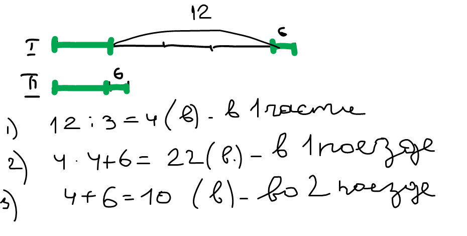 Х = 10 вагонов было в первом составе. 10 + 12 = 22 вагона было во втором составе