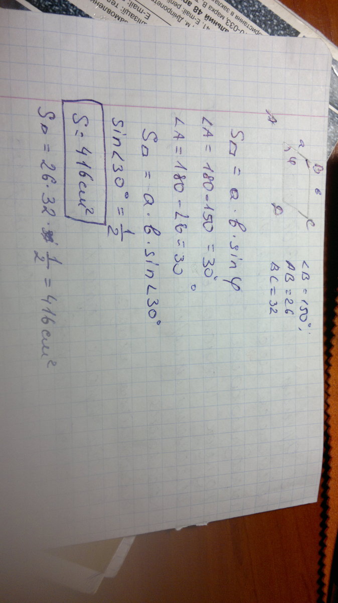 в параллелограмме abcd угол b равен 150 градусов ab=26 см bc=32 см. найдите площадь параллелограмма