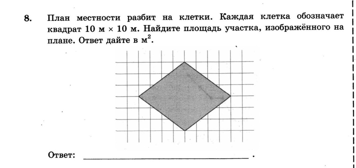 S = (8*6) / 2 = 24 клетки. Площадь 1 клетки 10*10 = 100 м².