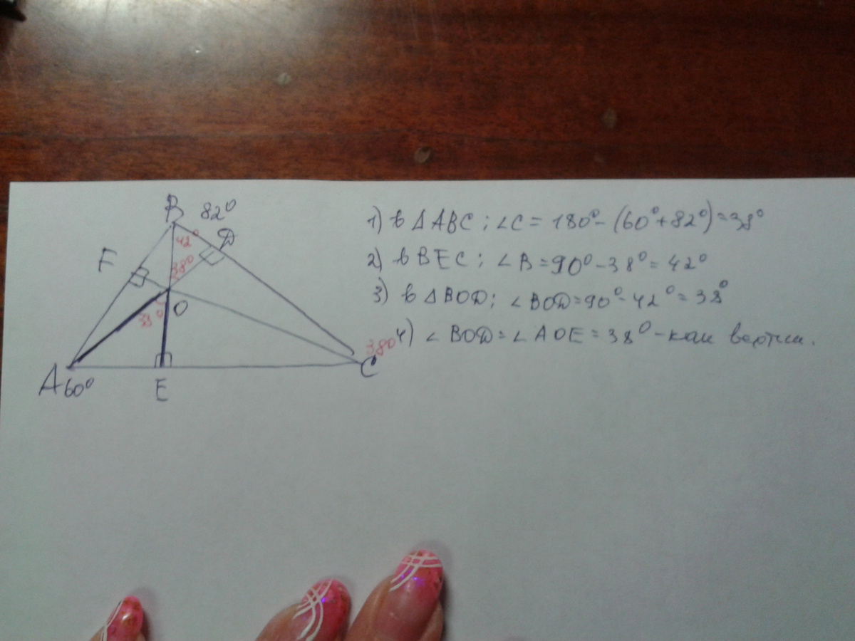 В треугольнике ABC угол A равен 60 градусам,а угол B равен 82 градусам.AD,BE и CF-высоты пересекающиеся в точке O.найдите угол AOF