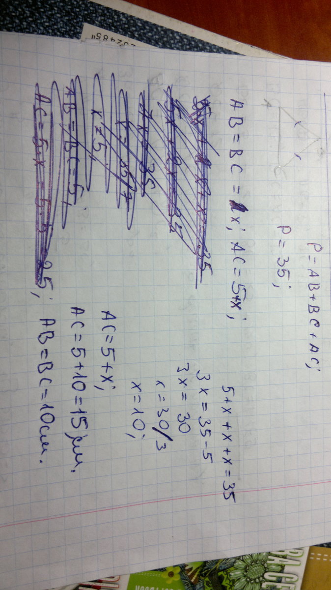 осн=15, бок стороны 15-5=10 см Р= 15+10+10=35 все верно