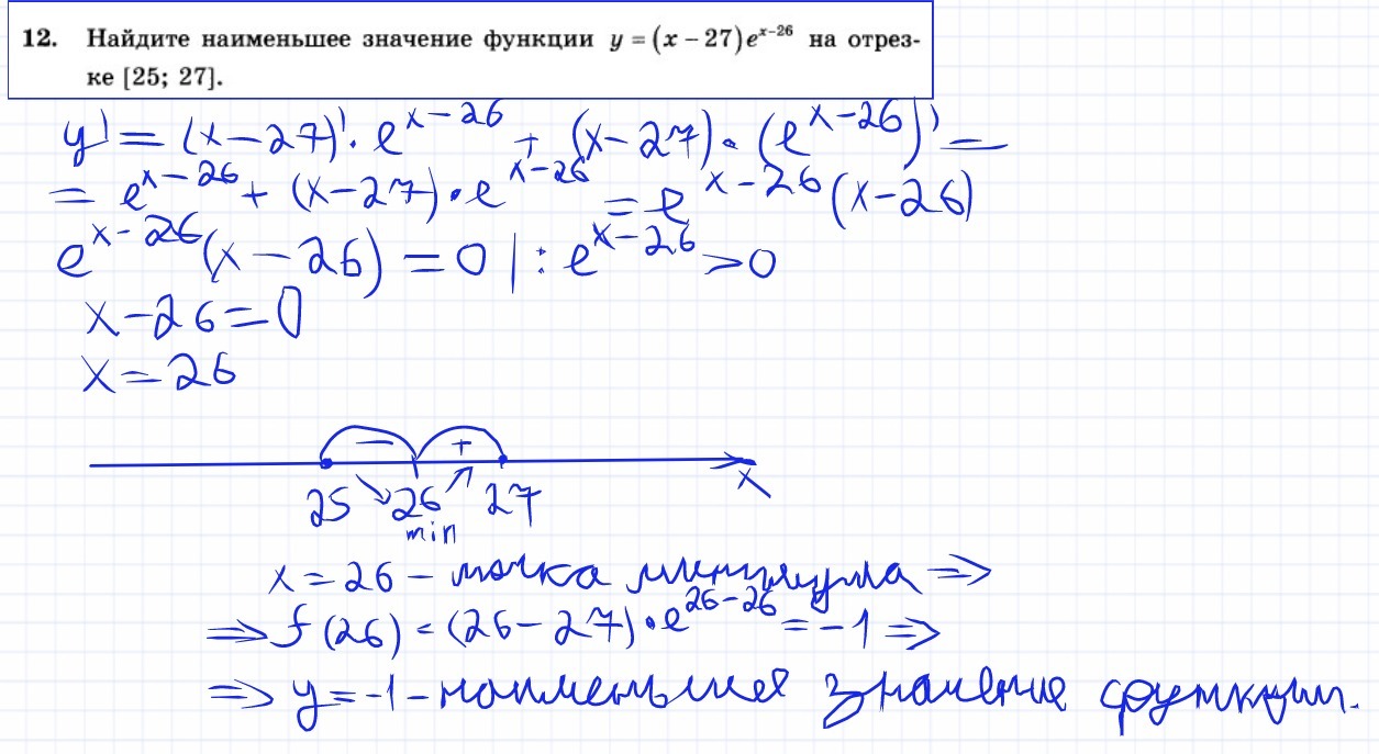 Найти производную функции, приравнять её к нулю, проверить, попадают ли нули производной в область определения функции. Найти промежутки знакопостоянства производной, то есть узнать знаки производной на всей области определения. Там, где знак производной меняется с - на + и функция опредеделена, имеем точку минимума, соответственно значение функции в этой точке будет минимальным значением функции, а там, где с + на -, соответственно точку максимума. Если поиск наименьшего значения осуществляется на отрезке, и на этом отрезке производная имеет точку максимума, то наименьшее значение функции будет искаться на краях отрезка. Если поиск наименьшего значения осуществляется на отрезке, и на этом отрезке производная имеет точку минимума, то наименьшее значение функции будет достигаться в этой точке. В некоторых случаях, путём рассуждений, можно найти минимальное значение не используя производную. Например, если у нас квадратичная функция с ветвями вверх, то наименьшее значение функции будет достигаться в вершине.параболы. Пример во вложении.