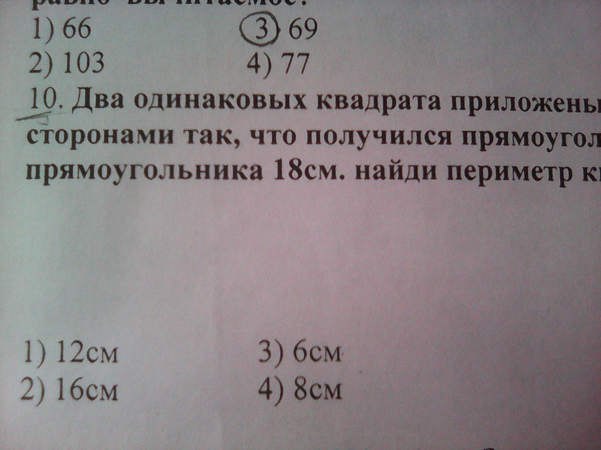 Помогите решить Два одинаковых квадрата приложены друг другу сторонами так, что получился прямоугольник . Периметр этого прямоугольника 18 см .Найди периметр квадрата.