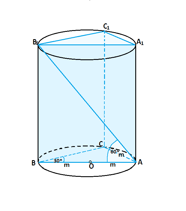 Так как катет АС, равный m, противолежит углу 30°, гипотенуза