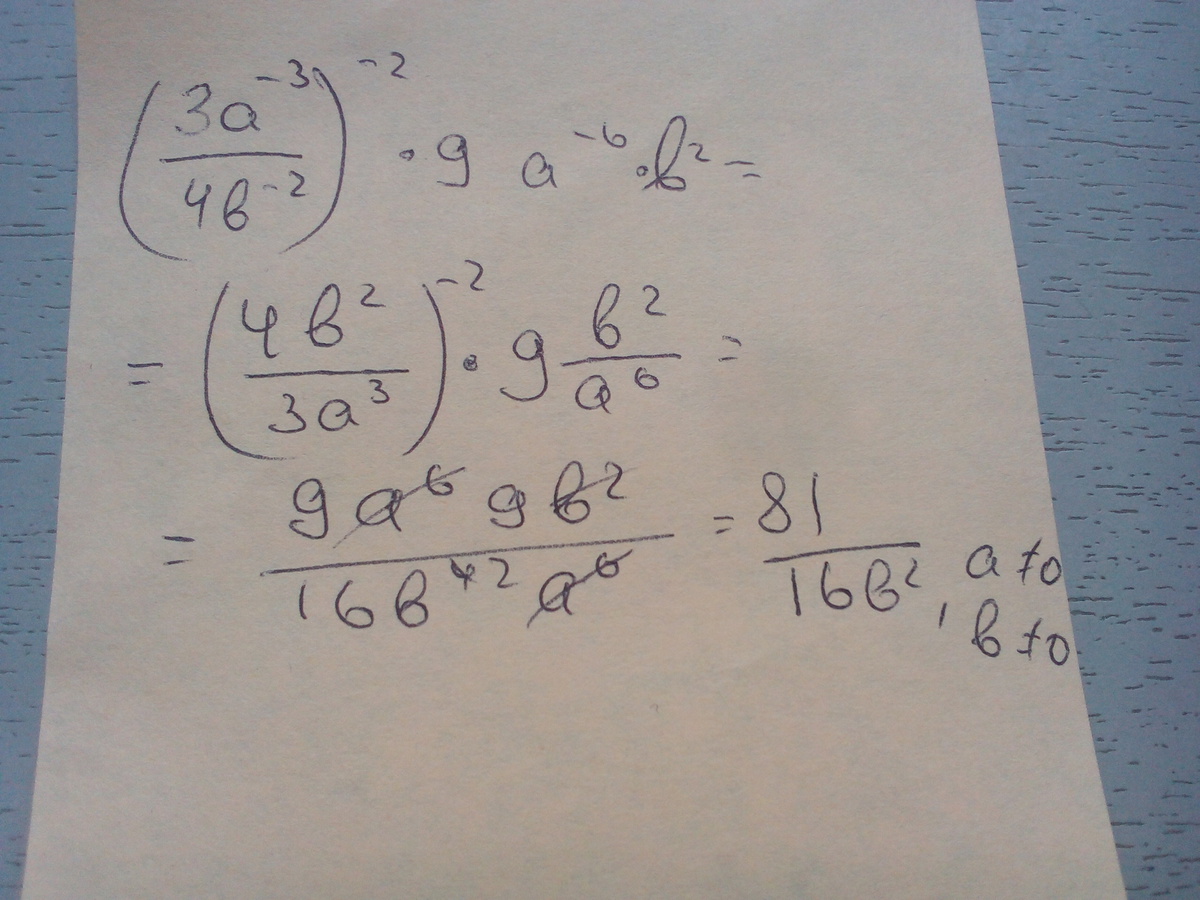 (3а^-3 / 4b^-2)^-2= 3^-2 а^6 / 4^-2 b^4= 16а^6 / 9 b^4