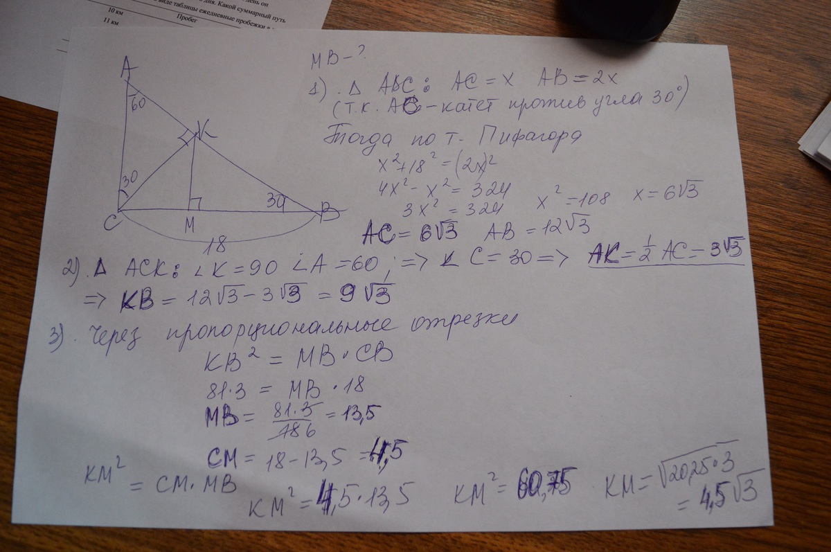 В прямоугольном треугольнике ABC угол С=90 градусов угол В=30 градусов Bc=18 см, CK - высота, проведенная к стороне АВ, КМ - перпендикуляр, проведенный из точки К к стороне ВС. Чему равна длина МВ?