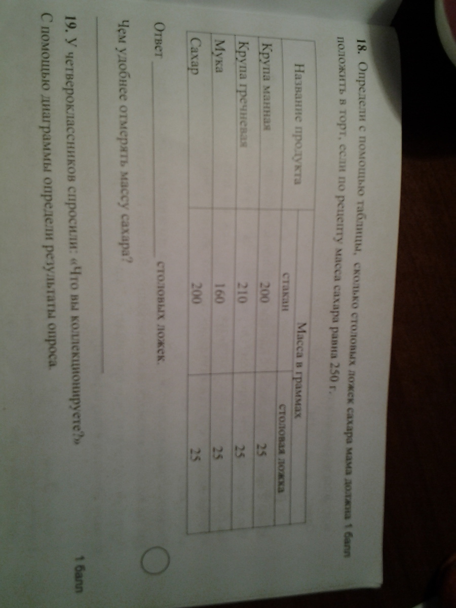 определи с помощью таблицы сколько столовых ложек сахара мама должна положить в торт если по рецепту масса сахара равна 250 грамм.