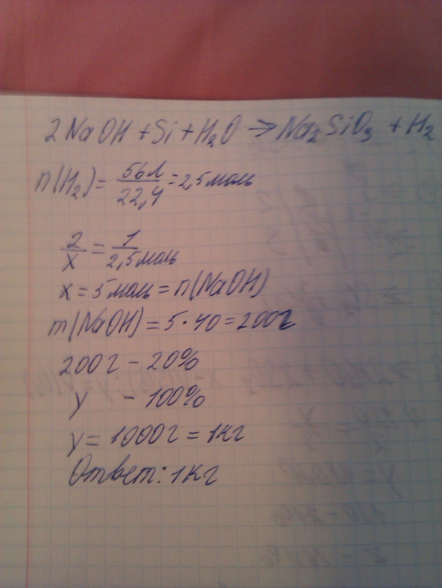 в раствор гидроксида натрия поместили кремний.Произощло выделение 56 л водорода.Определить массу раствора щелочи, если массовая доля NaON в нем соста вляла 20%»