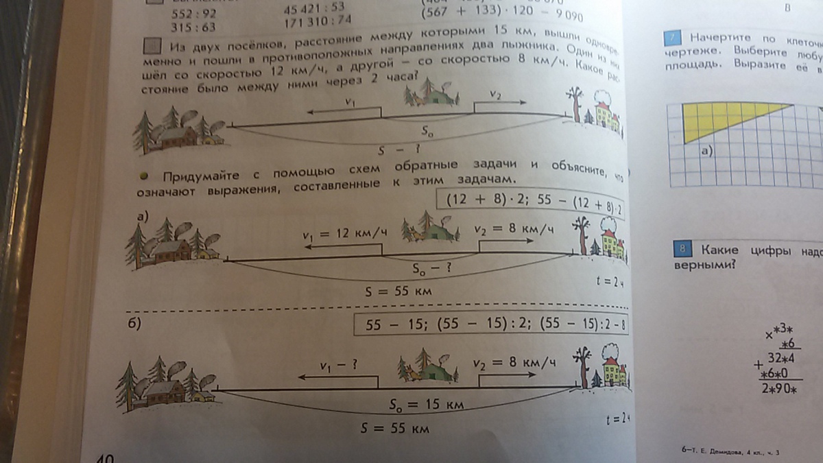 Из двух поселков одновременно в противоположных направлениях вышли два лыжника. Скорость одного 12 км/ч, а другого 8 км/ч. Какое расстояние между ними было через 2 часа? Какое расстояние между поселками, если весь путь 55 км?