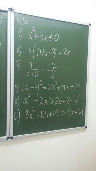 1)х^2+3х《0; х (х+3)《0; х《0 илм х+3《0; х《-3 ...............,,,,,,.......2)3 (10х-7)<2х; 30х-21 <2х; 28х <21; х <3/4; х <0,75 ...3)7/х+6=-7/6; 7/х=(-7-36)/6; 7/х=-43/6; 7=-43х/6; 42=-43х; х=-42/43 4) (х-7)^2=2х^2+11х+23; х^2+49-14х-2х^2-11х-23=0; -х^2-25х+26=0; х^2+25х-26=0 Д=625+104=729=27^2; х1=25-27/2=-1; х2=25+27/2=52/2=26 ; 5) х^2-12х》2х-12-х^2; 2х^2-14х+12》0; х^2-7х+6》0; Д=49-24=25=5^2>0; х1=7-5/2=2/2=1; х2=7+5/2=12/2=6 .....6) 3х^2+10х+19>(х+7); 3х^2+9х+12>0; х^2+3х+4>0; Д=9-16=-7 <0-нет корнкй