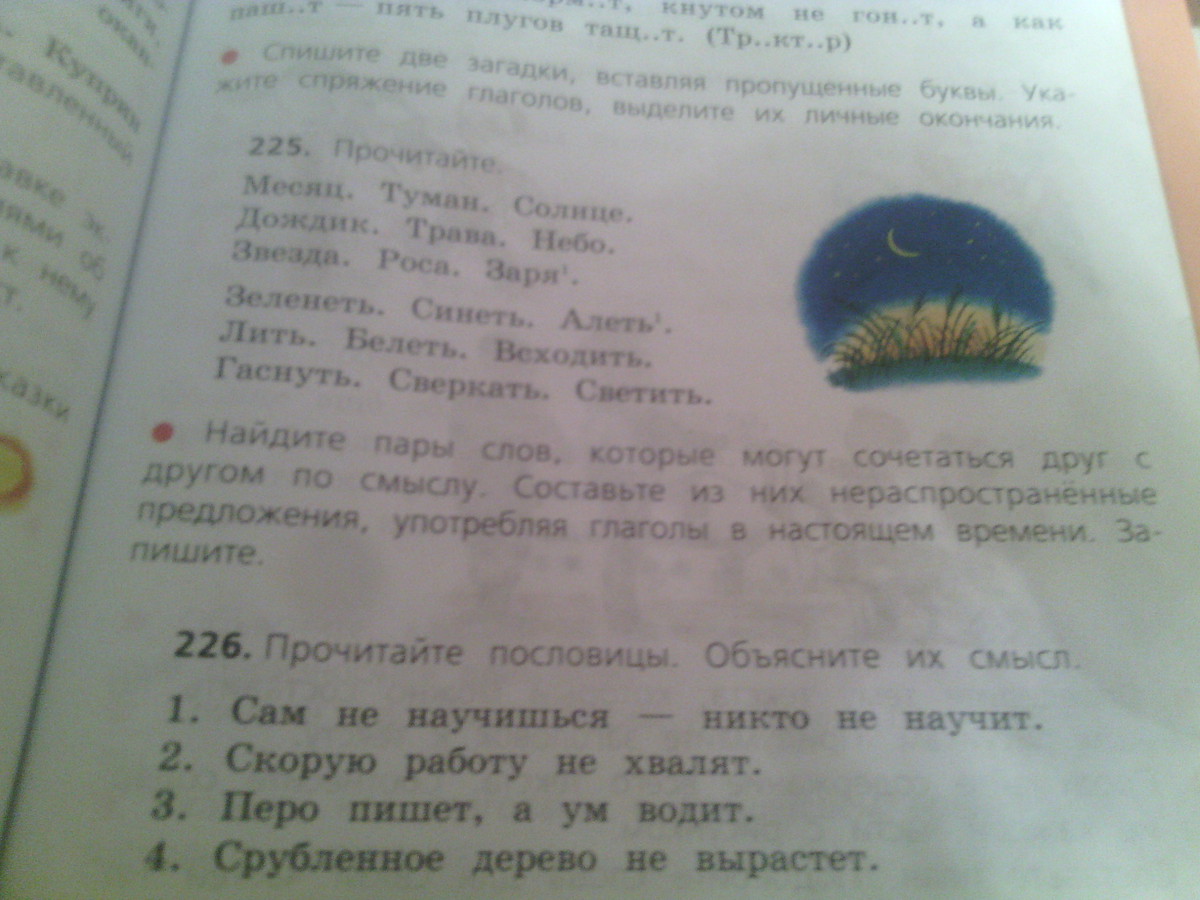 Солнце светит. Небо синеет. Звезда сверкает. Месяц всходит. Дождик льет. Трава всходит. Заря алеет. . Роса белеет.