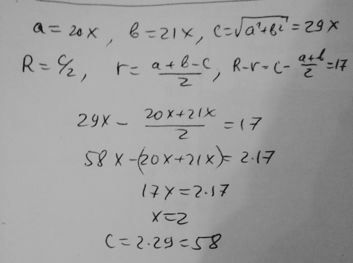 катети прямокутного трикутника відносяться як 20:21, а різниця між радіусами описаного та вписаного кіл дорівнює 17 см. Знайдіть гіпотенузу трикутника.