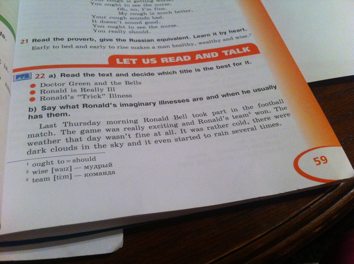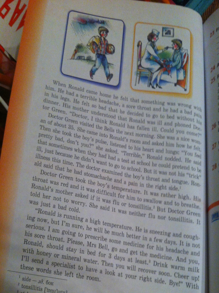 У Рональда продолжительная высокая температура. Он чихает и кашляет сейчас, но я уверена, ему будет лучше через несколько дней. Это не серьёзно. Я пропишу немного лекарств для его головной боли и для боли в горле. Пожалуйста, Миссис Белл, идите и достаньте лекарство. А тебе, Рональд, следует оставаться в постели до трёх дней, по крайней мере, Выпей тёплого молока с мёдом или минеральную воду. Затем ты вылечишься скоро. Не унывай! Я пошлю специалиста, чтобы он посмотрел на твой правый бок. Пока!" С этими словами она покинула комнату.