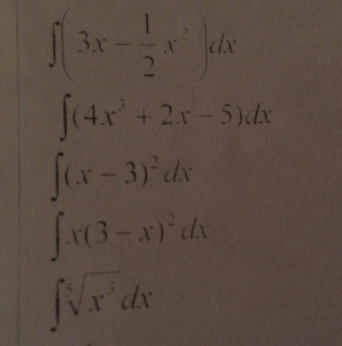 1. S(3х-1/2x^2)dx= S3xdx-S1/2x^2dx=3x^2/2-1/2*x^3/3=3/2*x^2-1/6*x^3+C