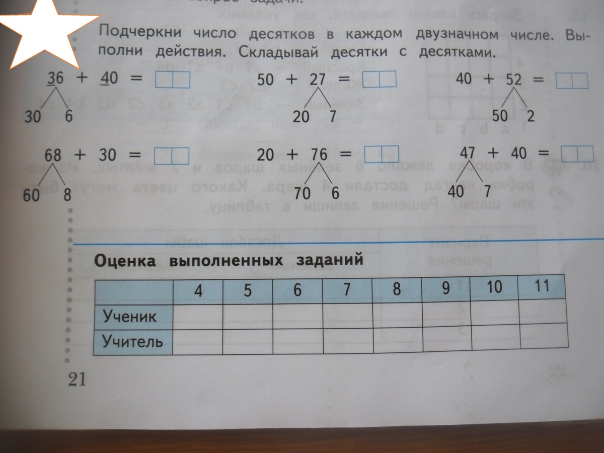 Подчеркни число десятков в каждом двузначном числе.Выполни действия.Складывай десятки с десятками.