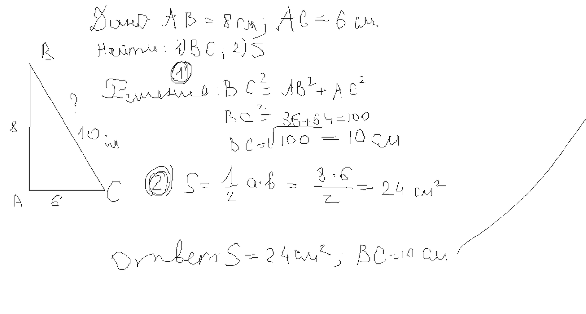 Катеты прямоугольного треугольника равны 6см и 8 см. Найти гипотенузу и площадь треугольника.дайте решение пожалуйста и Дано