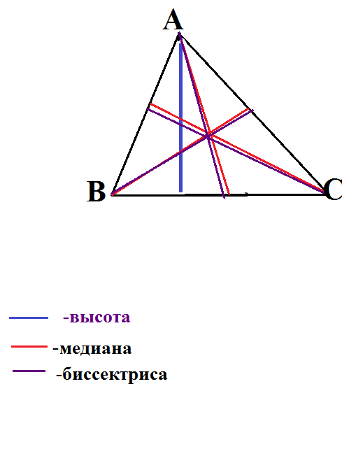 Решение на изображении, его можно сохранить на компьютер и рассмотреть получше.Тёмно-синем отмечена высота(извини, что она одна),медианы-красным,также на рисунке есть 3 биссектрисы.
