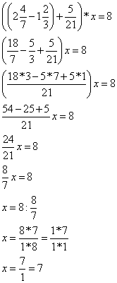 ((2/4/7 - 1/2/3) + 5/21) * х = 8.