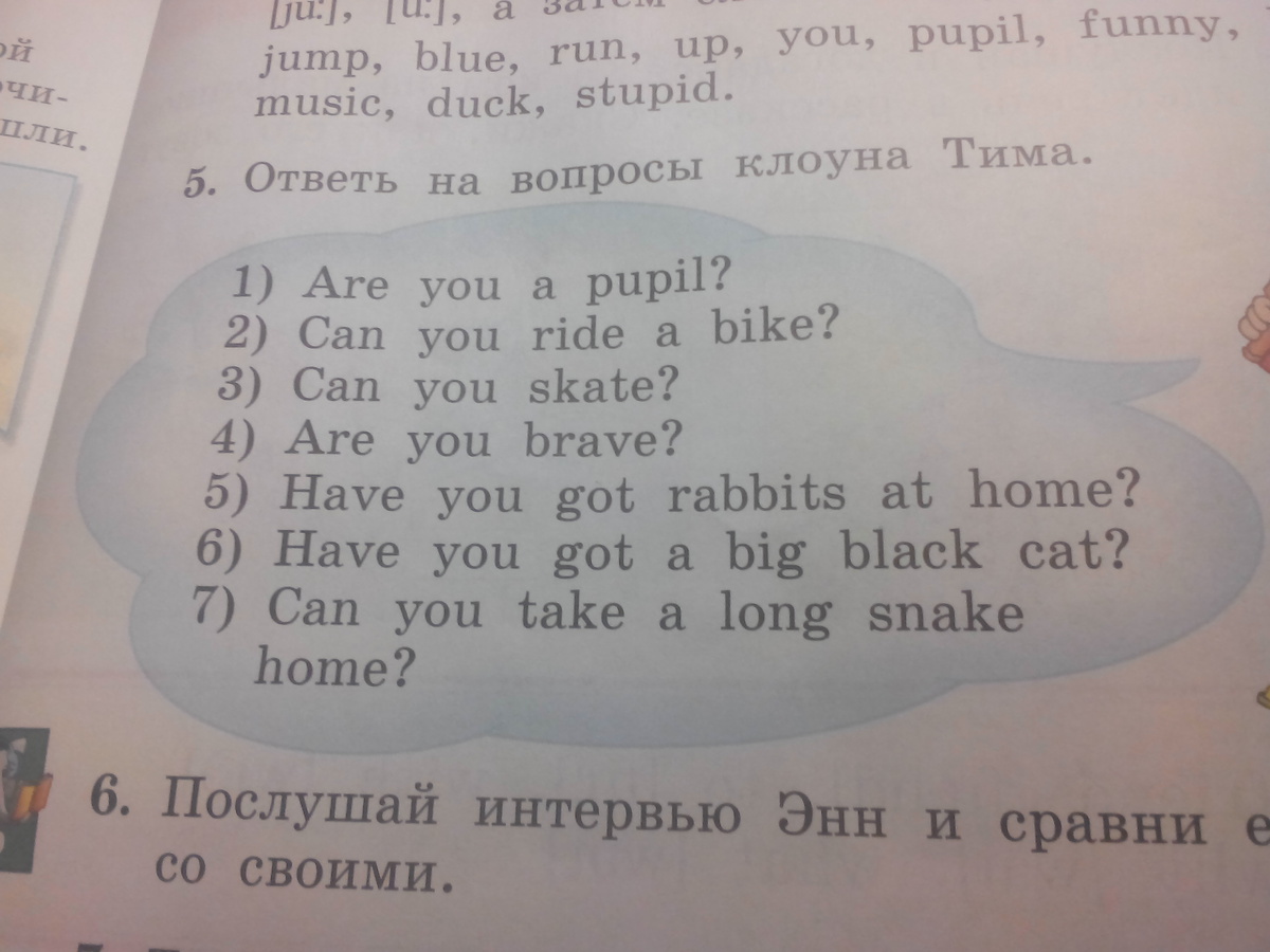 1) вы-ученик? 2) Можете ли вы ездить на велосипеде? 3) Можете ли вы на коньках? 4) вы храбрый? 5) У вас есть дома кролики? 6) у вас есть большая черная кошка? 7) вы можете принять длинную змею домой?