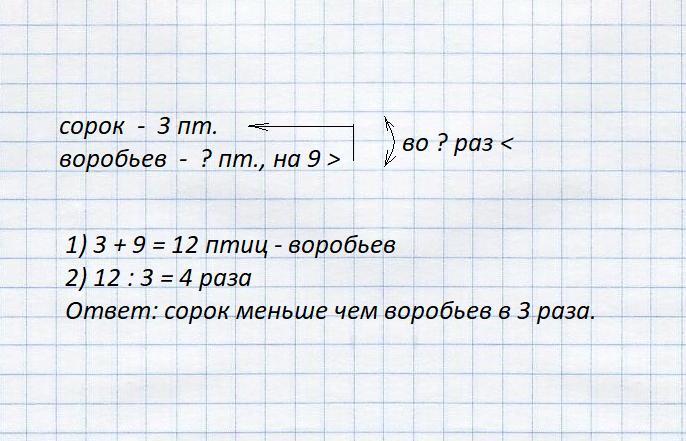 На дереве сидят 3 сороки а воробьев на 9 больше чем сорок. Во сколько раз сорок меньше чем воробьев?