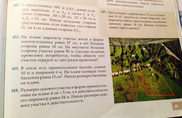 на плане большая сторона 18 см, на местности 90 м. Коэффициент перевода (масштаб) 90/18=5 м/см