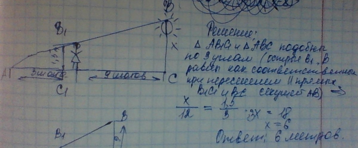 Человек ростом 1,5 м стоит расстоянии 9 шагов от столба, на котором висит фонарь. Тень человека равна трём шагам. На какой высоте (в метрах) расположен фонарь?