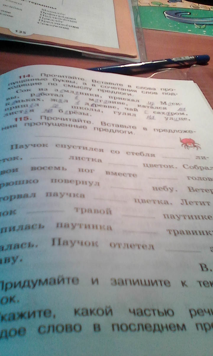 Повернул к небу. паучка ОТ цветка. Паучок НАД травой К паутинке. Паутинка ЗА травинку. отлетел В траву (не вижу что там написано).