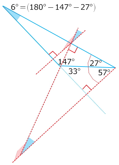 у них будет общий угол, равный 27°+57°=84°, следовательно и третьи углы в них будут равны (по 6°) --это острый угол между высотами...