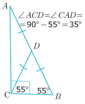1) В треугольнике ABC CD - медиана, угол ACB равен 90°, угол B равен 55°. Найдите угол ACD. Ответ дайте в градусах.