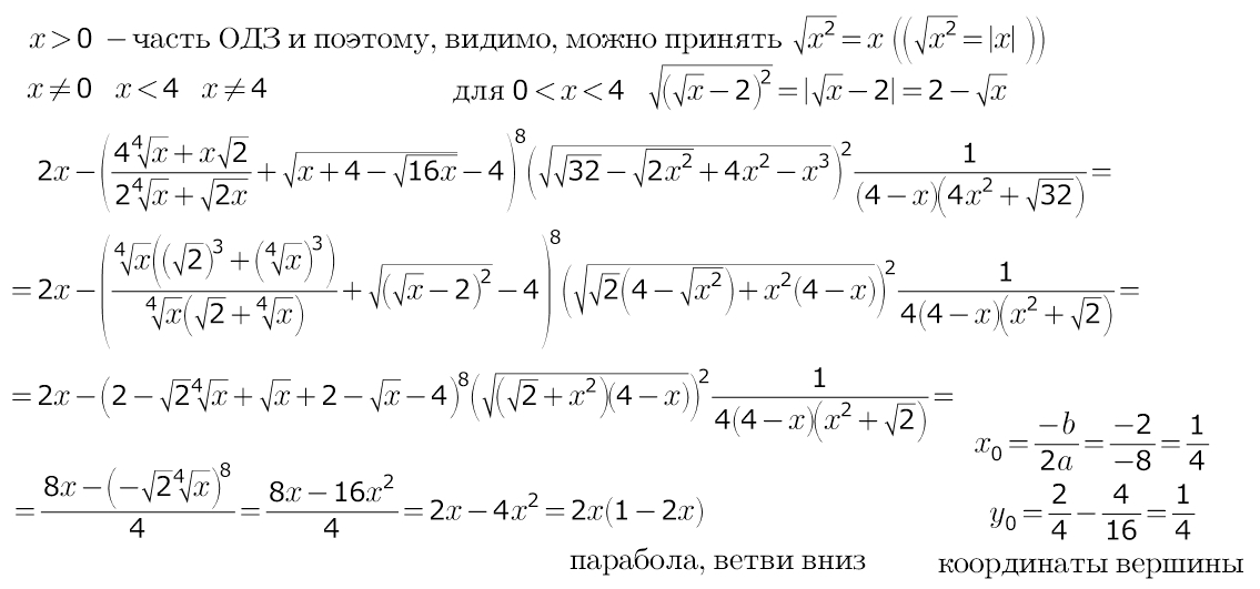 Начало:![f(x)=2x- ( \frac{4 \sqrt[4]{x}+x \sqrt{2} }{2\sqrt[4]{x}+ \sqrt{2x} }+ \sqrt{x+4- \sqrt{16x} }-4 )^{8}* f(x)=2x- ( \frac{4 \sqrt[4]{x}+x \sqrt{2} }{2\sqrt[4]{x}+ \sqrt{2x} }+ \sqrt{x+4- \sqrt{16x} }-4 )^{8}*](https://tex.z-dn.net/?f=f%28x%29%3D2x-+%28+%5Cfrac%7B4+%5Csqrt%5B4%5D%7Bx%7D%2Bx+%5Csqrt%7B2%7D++%7D%7B2%5Csqrt%5B4%5D%7Bx%7D%2B+%5Csqrt%7B2x%7D+%7D%2B+%5Csqrt%7Bx%2B4-+%5Csqrt%7B16x%7D+%7D-4++%29%5E%7B8%7D%2A+)